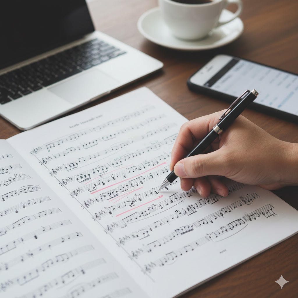 - 移動中・休憩中: 楽譜を眺めて、頭の中で音楽を鳴らす(イメージトレーニング)。