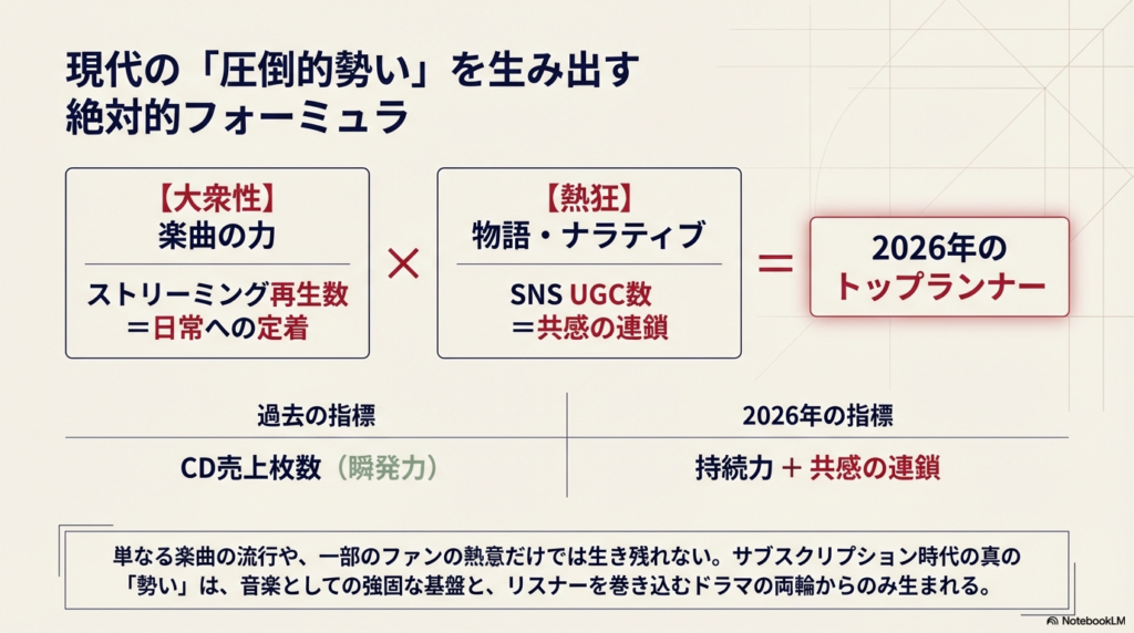 2025年後半から2026年にかけての音楽チャートを分析すると、一つの明確な傾向が見えてきます。それは、「大衆性(ポピュラリティ)」と「ファンダム(熱心なファン層)」の両輪が噛み合っているグループが上位を独占しているという点です。単に曲が流行っているだけでも、単にファンが熱心なだけでも、長期的な「勢い」は維持できません。