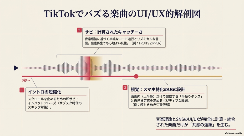 一つ目は、「サビのフレーズが極めてキャッチーで、短期間で反復されること」です。例えば、FRUITS ZIPPERの『わたしの一番かわいいところ』や、それに続く楽曲群は、聴いた瞬間に口ずさめる分かりやすさと、一度聴いたら頭から離れない中毒性を持っています。これは音楽理論的に見ても、単純なコード進行の上で、リズミカルに言葉を乗せる手法が徹底されており、倍速再生で聴いても心地よいリズム感が計算されています。