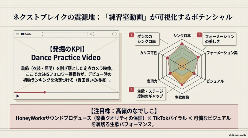 また、2026年は大手芸能事務所からの新人デビューラッシュが続いています。特に注目すべきは、公式YouTubeチャンネルで公開される「Dance Practice Video(練習室動画)」です。豪華な衣装や照明のない定点カメラの映像で、どれだけダンスが揃っているか、フォーメーション移動が美しいかを見ることで、そのグループの基礎能力とポテンシャルが分かります。デビュー前からSNSフォロワーが数十万人を超えるようなグループは、初動からランキングを賑わせることが確実視されており、まさに「青田買い」の楽しみがあります。