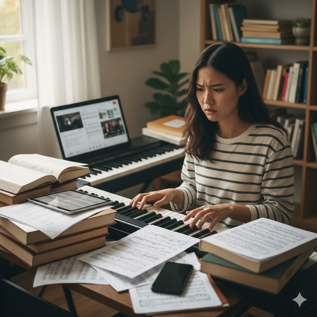 ジャズピアノを始めようと思い立ったとき、多くの初心者が最初にぶつかるのが「情報の多さ」と、それに伴う「選択の麻痺」という壁です。現代はYouTubeやブログ、SNSでプロの演奏やレッスン動画が無料で見られる素晴らしい時代ですが、それゆえに情報過多に陥りやすいのです。