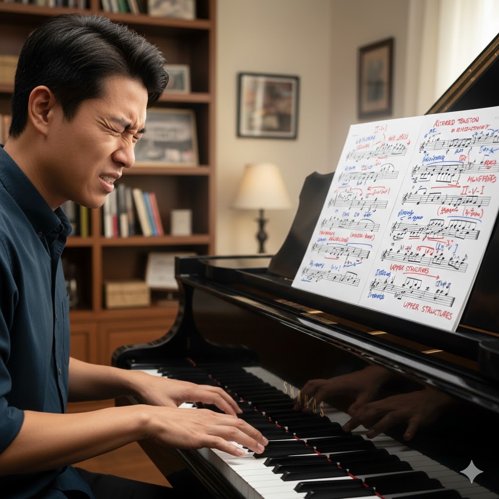 ジャズには独特の複雑な音楽理論が存在します。「ツーファイブワン(II-V-I)」から始まり、「オルタードテンション」、「アッパーストラクチャー」、「モード(旋法)」といった専門用語の数々は、文字で読んでいるだけではなかなか頭に入ってきません。市販の理論書は非常に優れたものが多いですが、その多くは「ある程度弾ける人」や「音楽的な基礎知識がある人」を前提に書かれていることが多く、完全な初心者には解読不能な暗号のように見えることもあります。