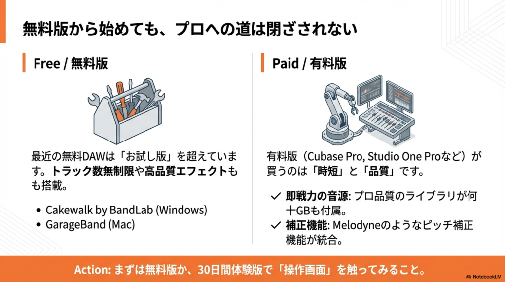 予算には限りがあると思うので、最初はソフトを無料版にして浮いたお金をPCのスペックアップや良いヘッドホンに回すというのも、非常に賢いやり方ですね。