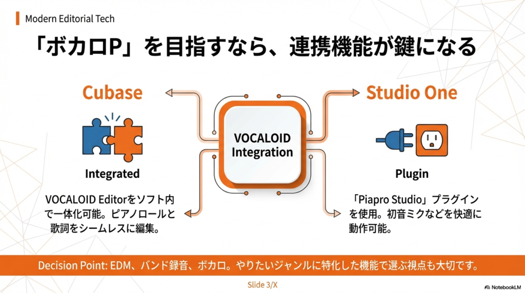 もしあなたが「ボカロPになりたい!」「初音ミクに歌わせたい」という明確な目標を持って作曲を始めるなら、VOCALOIDとの連携機能は絶対に外せないポイントになります。ボカロ曲を作る工程は、通常の楽器だけの曲作りとは少し異なり、「歌詞とメロディを入力して調整する」という作業が頻繁に発生するからです。