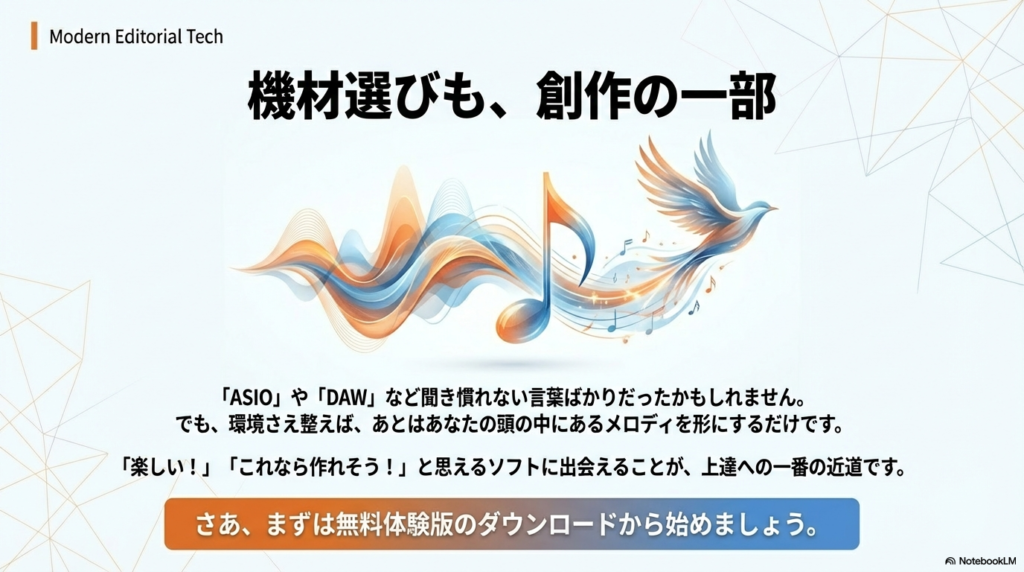 環境さえ整ってしまえば、あとはあなたの頭の中にあるメロディを形にするだけです。まずは気になったソフトの無料体験版をダウンロードして、自分のパソコンで動かしてみることから始めてみてはいかがでしょうか。「楽しい!」「これなら作れそう!」と思えるソフトに出会えることが、上達への一番の近道だと私は思います。