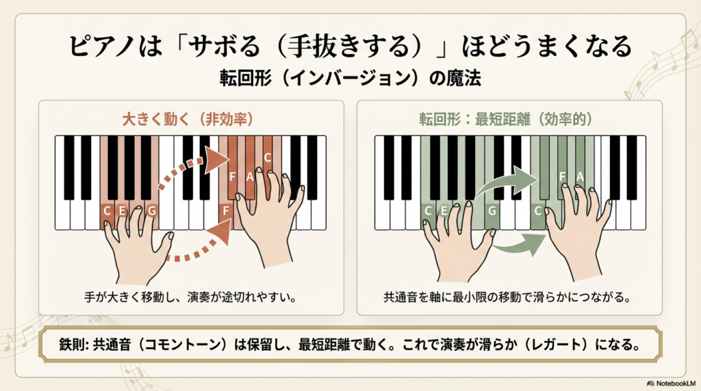 このように、「共通する音(コモントーン)は保留し、他の音を最短距離で移動させる」というのが、美しいコード進行を弾くための鉄則です。これができると、演奏が滑らか(レガート)になるだけでなく、目線を行ったり来たりさせる必要もなくなり、ミスタッチも激減します。「いかに手を動かさずにサボるか」を考えることが、結果的に上手な演奏につながるのです。