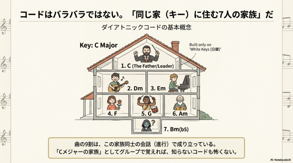 この7つのコードは、言わば「同じ家(キー)に住んでいる家族」のようなものです。曲の9割近くは、この家族同士の会話(進行)で成り立っています。この家族関係を知っているだけで、知らないコードが出てきても「あ、この曲はCメジャーだから、次はFかGが来る可能性が高いな」と予測できるようになるんです。