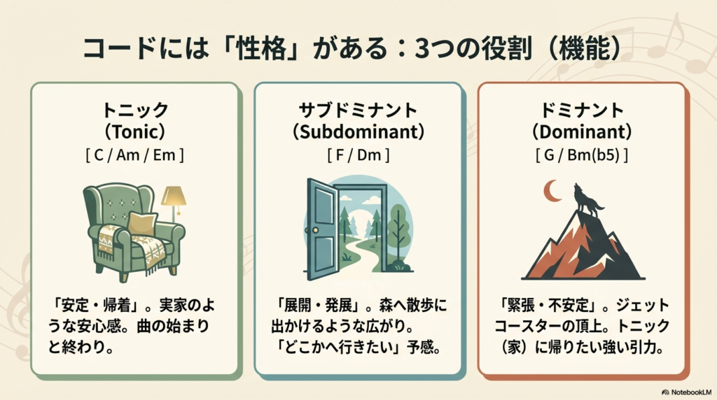 コードの構成音が分かったら、次はそれぞれのコードが持っている「役割(機能)」について見ていきましょう。実は、コードには人間関係のように「性格」や「役割」があるんです。この役割を理解することは、既存の曲を分析するだけでなく、自分で作曲やアレンジをする上で非常に重要です。