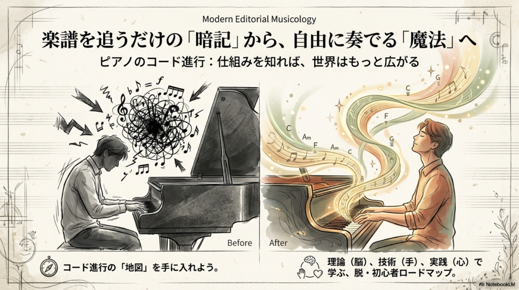 まずは、ピアノを弾くうえで避けては通れないコード進行の仕組みと種類に関する基礎知識からお話しします。ここを理解すると、丸暗記ではなく「なぜその音になるのか」が腑に落ちるようになります。少し理屈っぽく感じるかもしれませんが、ここが分かるとピアノの世界が急に開けて見えますよ。