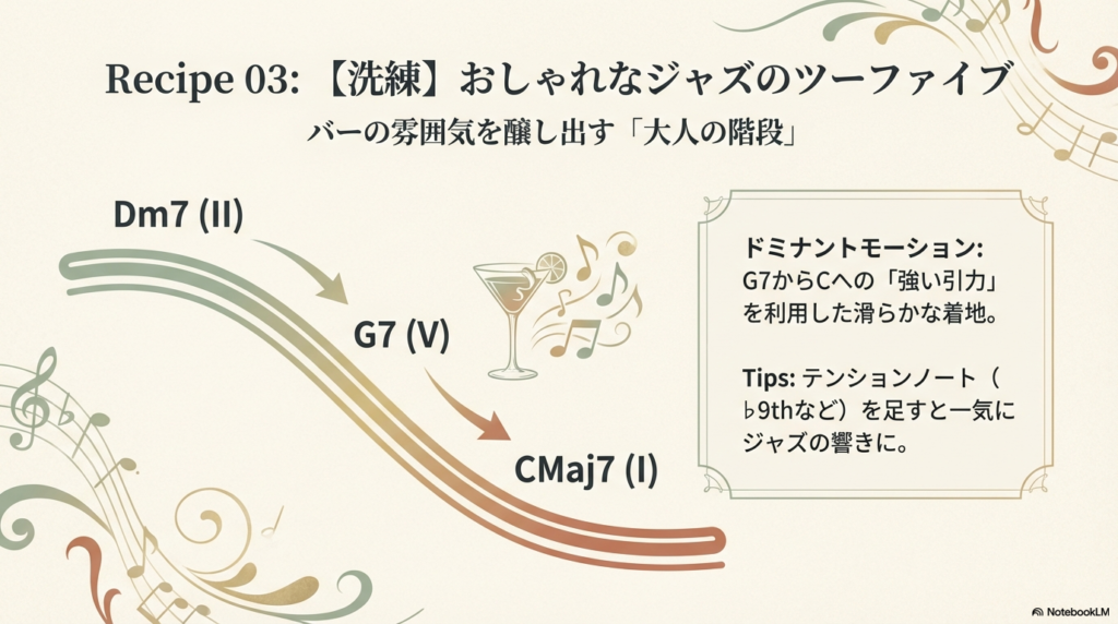この進行の核となるのは、「G7(ドミナント)」から「C(トニック)」へ解決しようとする強い引力(ドミナントモーション)です。この引力をさらに強めるために、その手前に「Dm7」を置くことで、助走をつけてジャンプするような滑らかな流れを作っています。