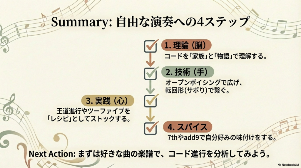 まずは、自分の好きな曲の楽譜を見て、「あ、ここはツーファイブだ」「ここはカノン進行だ」と分析してみることから始めてみてください。そして、今回紹介した「転回形」や「ボイシング」を意識して、実際に鍵盤を叩いてみましょう。頭で理解するのと同時に、耳と指でその響きを覚えていくことが大切です。少しずつ手になじませていけば、きっとあなただけの素敵で自由な演奏ができるようになりますよ。一緒にピアノライフを楽しんでいきましょう!