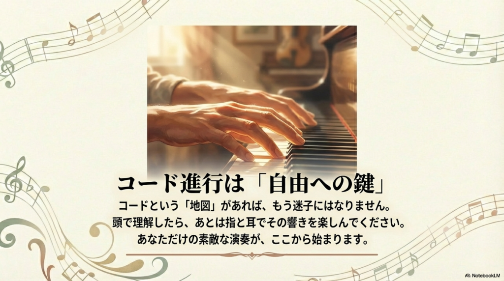 今回は、ピアノのコード進行の仕組みと種類について、基礎理論から実践的なパターン、そして練習方法まで幅広くお話ししてきました。コード進行は、最初は無機質な記号の羅列に見えるかもしれませんが、その裏にある「役割」や「響きのルール」を知ることで、ピアノという楽器がもっと自由で、もっと感情を表現できるツールに変わります。