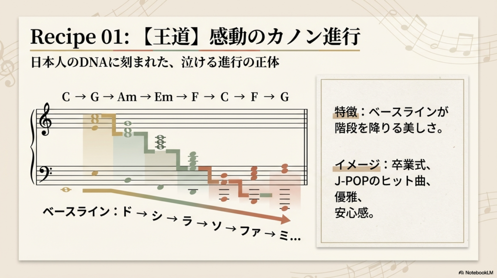 「負けないで(ZARD)」や「さくら(独唱)(森山直太朗)」など、時代を超えて愛される名曲の多くがこの進行、あるいはこの変形パターンで作られています。ピアノで弾く際は、左手でこのベースラインの下降を強調し、右手でアルペジオ(分散和音)を奏でるだけで、初心者でも簡単に感動的な演奏ができます。結婚式のBGMや余興などでも鉄板の進行ですね。